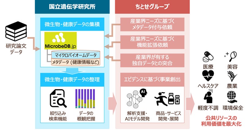大学共同利用機関法人情報・システム研究機構 国立遺伝学研究所 (静岡県三島市、以下遺伝研)とちとせグループの中核法人である株式会社ちとせ研究所(神奈川県川崎市、以下ちとせ)は、このたび、黒川顕教授・森宙史准教授らが中心となって開発を進める微生物統合データベースMicrobeDB.jp(注釈1)の民間利活用・社会実装促進を目的とした提携を行います。遺伝研の集積する大規模微生物データを、ちとせの有するAI技術や解析基盤(注釈2)を用いた解析サービスに活用することで、ヘルスケア産業界でのデータの利活用促進に貢献します。
