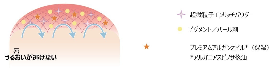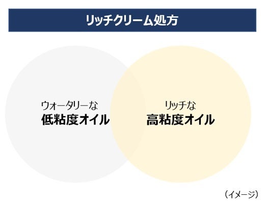 通常、スキンケアクリームは、水分と油分を乳化させることでうるおうのにべたつかないテクスチャーを実現しますが、その技術をリップカラーに応用するのは困難と考えられています。「リッチクリーム処方」は、スキンケアクリームの技術を唇に最適な方法で応用し、みずみずしいウォータリーなオイルと、こくのある高粘度のオイルをベストバランスで掛け合わせることで、うるおいを与え、保持しながらもべたつかないリッチなテクスチャーを実現しました。