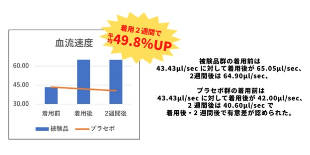 身体機能の改善に重要とされる基礎データでは、血流速度と両腕の可動域・筋硬度のすべての指標で、有意な成果が出ました。このうち、血流速度は、リライブシャツ・パンツを着用した被験品群の着用前は43.43マイクロリットル/秒だったのに対して着用後が65.05マイクロリットル/秒、2週間後は64.9マイクロリットル/秒、プラセボ群の着用前は43.43マイクロリットル/秒だったのに対して着用後が42.00マイクロリットル/秒、2週間後は40.6マイクロリットル/秒となり、着用後と2週間後で有意差が認められました。
