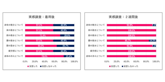 民間の検証機関との実証実験は、健康食品・化粧品の効果測定に関する試験業務を手がける株式会社TFCラボとともに実施しています。2021年2月に行った前回調査では、30〜40代の女性15人が参加し、被験者の多くで可動域や握力量、背筋力量が向上するとともに、日々の疲労感が軽減されたと明らかになりました。