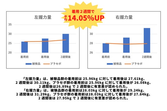 右握力量も、被験品群の着用前は28.03kgに対して着用後は29.24kg、2週間後は31.29kg、プラセボ群の着用前は28.03kgに対して着用後が27.84kg、2週間後は27.95kgとなり、左握力量と同様に2週間後に有意差が出ています。