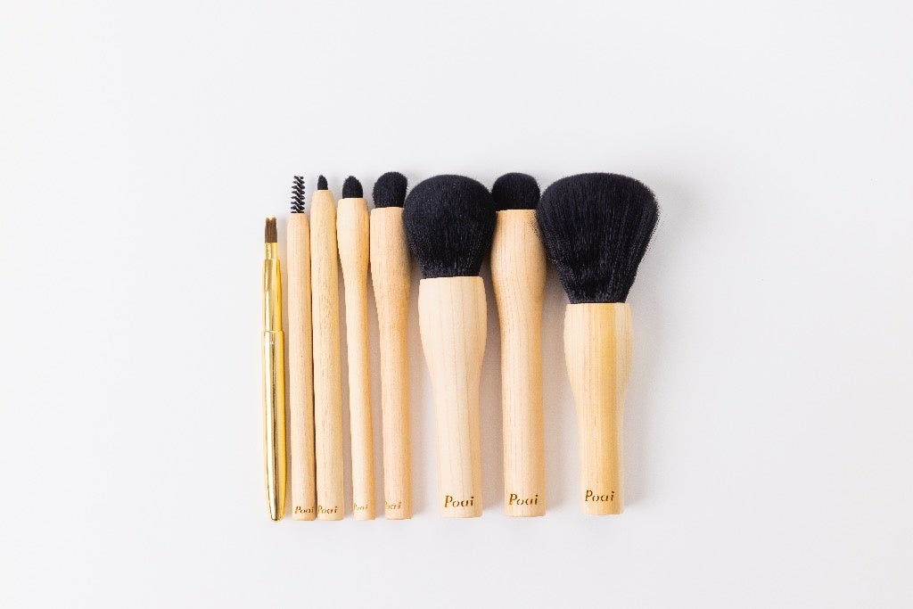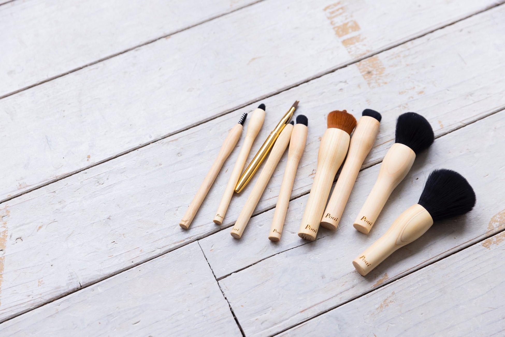 メイクブラシの持ち手には、広島県の間伐材のヒノキを使用。