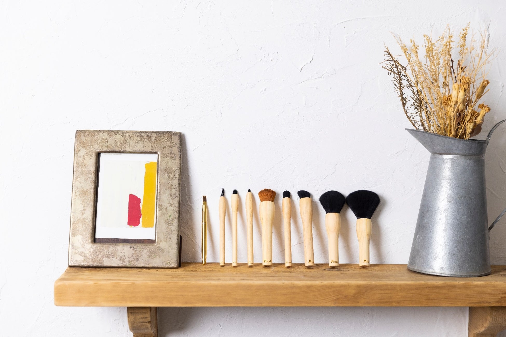 天然の木ならではの、1つ1つの木目や色が違う個性が、自然の織りなす美しさを感じることができる世界に一つだけの特別なメイクブラシ。持ち運びもしやすいコンパクトなサイズにしました。
