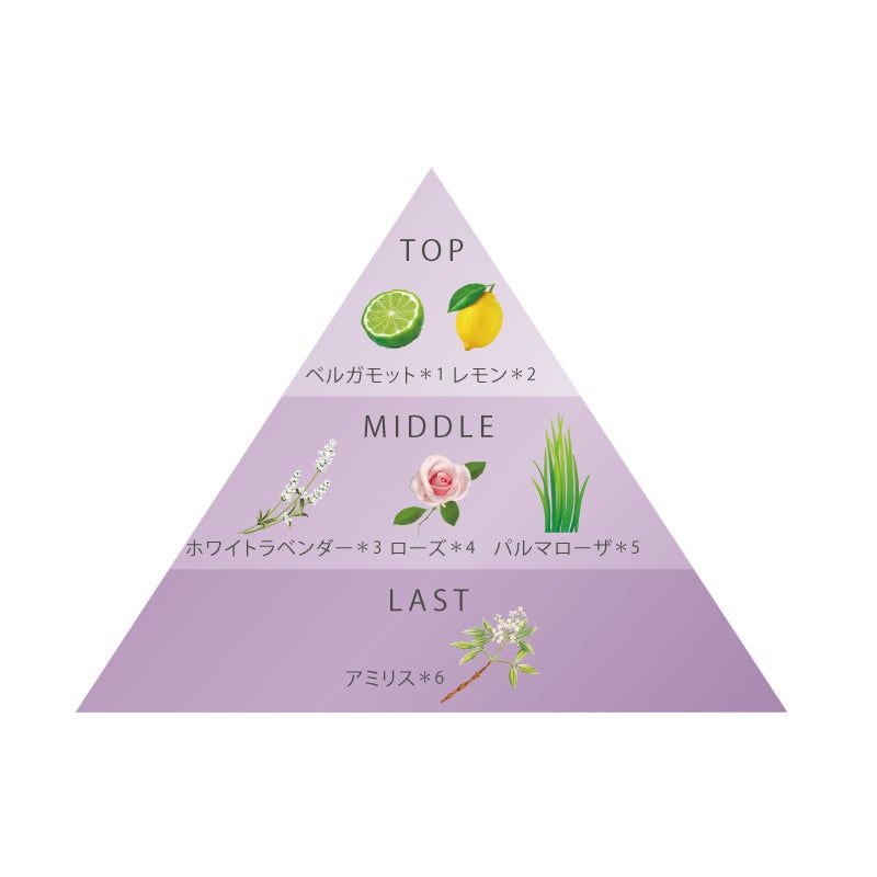 *1 ベルガモット果実油、*2 レモン果皮油、*3 ラベンダー油、*4 ダマスクバラ花油、*5 パルマローザ油