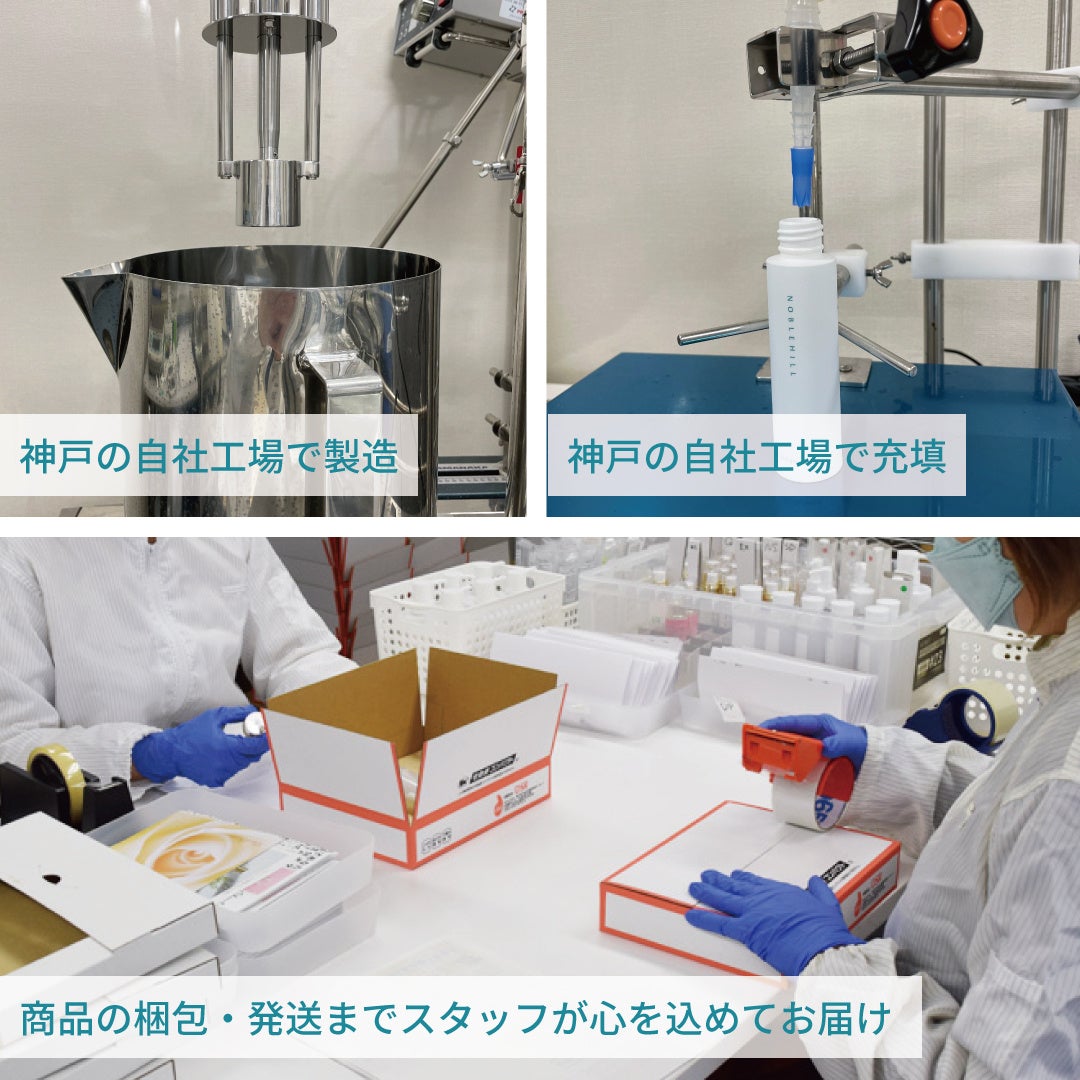 お肌へのやさしさを考慮し、安定剤や防腐剤はできる限り少なくしています。品質を保つためにエアレスボトルを採用しており、製造ロットごとに使用期限を記載しております。できるだけ作りたてのフレッシュな化粧品をお届けできるよう、国内の自社工場で少量生産、1本1本丹精込めて製造しています。製品づくりから最後の梱包まで、自社のスタッフが丁寧に心を込めてお届けします。