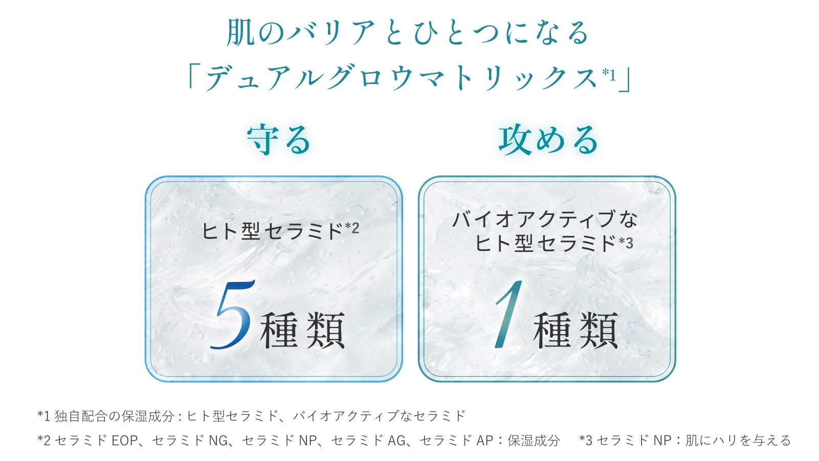 デュアルグロウマトリックス:保湿バリア機能のあるヒト型セラミド5種に加えて、お肌にハリを与えるなど様々な美容効果のあるバイオアクティブなヒト型セラミドを配合しました。