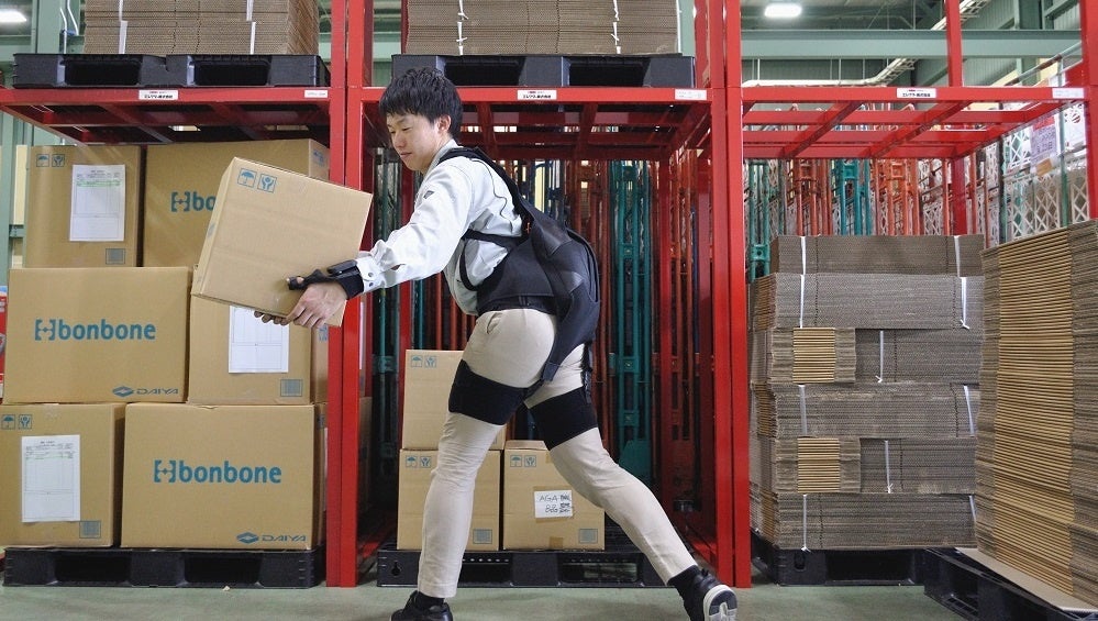中腰姿勢や持ち上げ作業からくる腰の負担を軽減する、衣服のようなアシストスーツ。