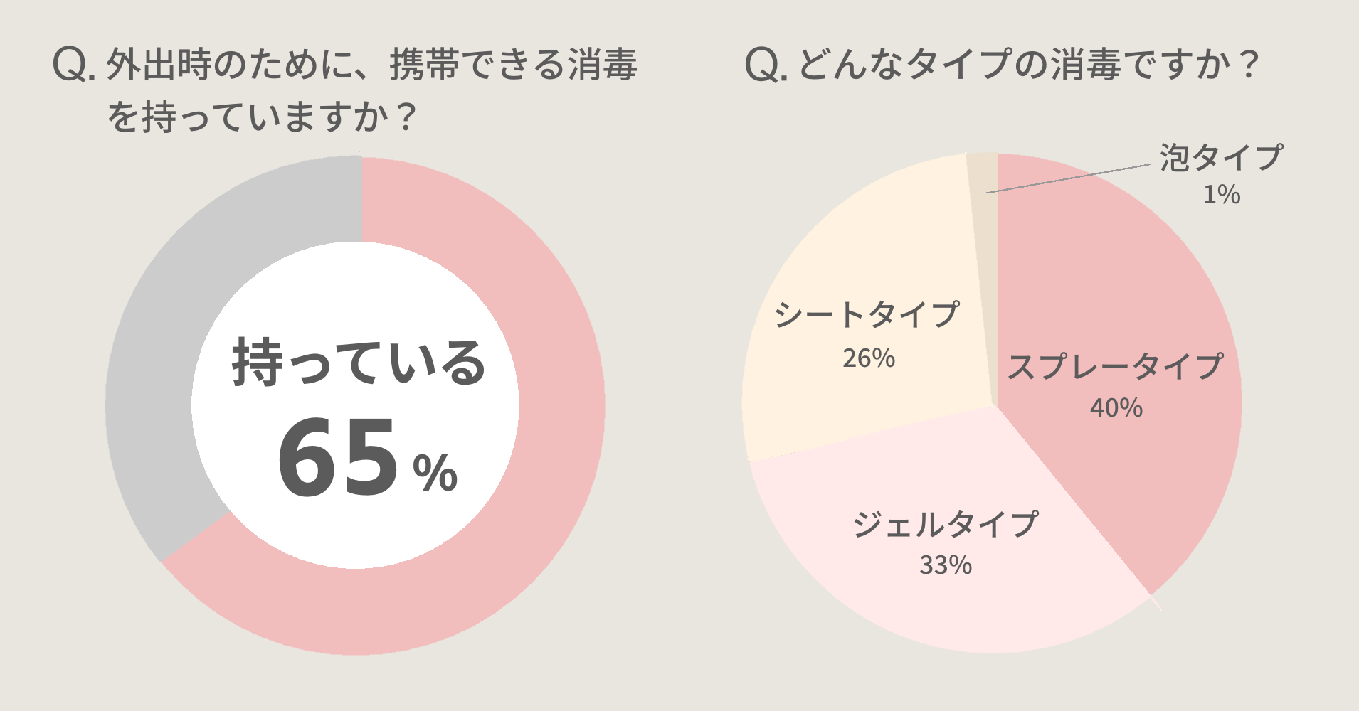 「外出時のために、携帯できる消毒を持っていますか?」とお尋ねしたところ、全体の65%の女性が「持っている」と回答しました。
