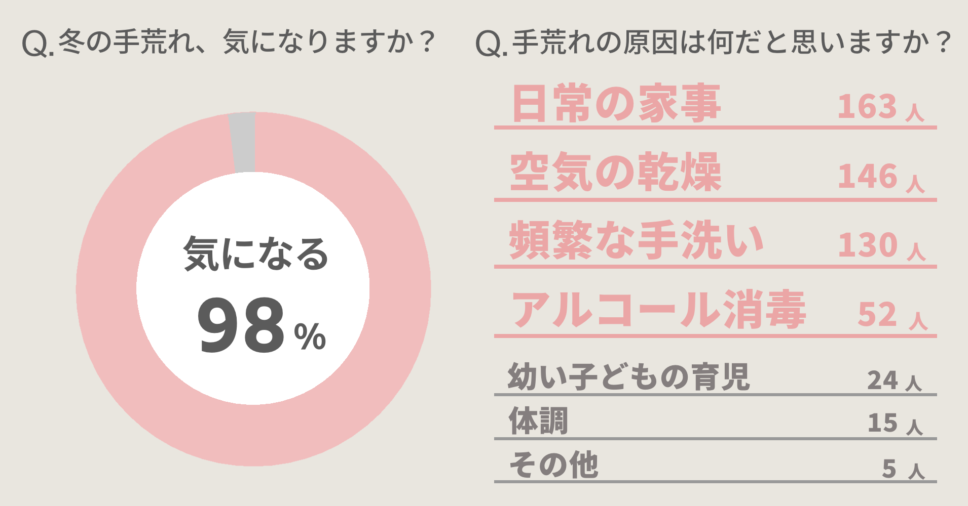20~40代女性に実施したアンケートによると、「冬の手荒れが気になる」と答えた女性は全体の98%。この季節、女性のほとんどが”手荒れ”に悩まされていることが分かります。