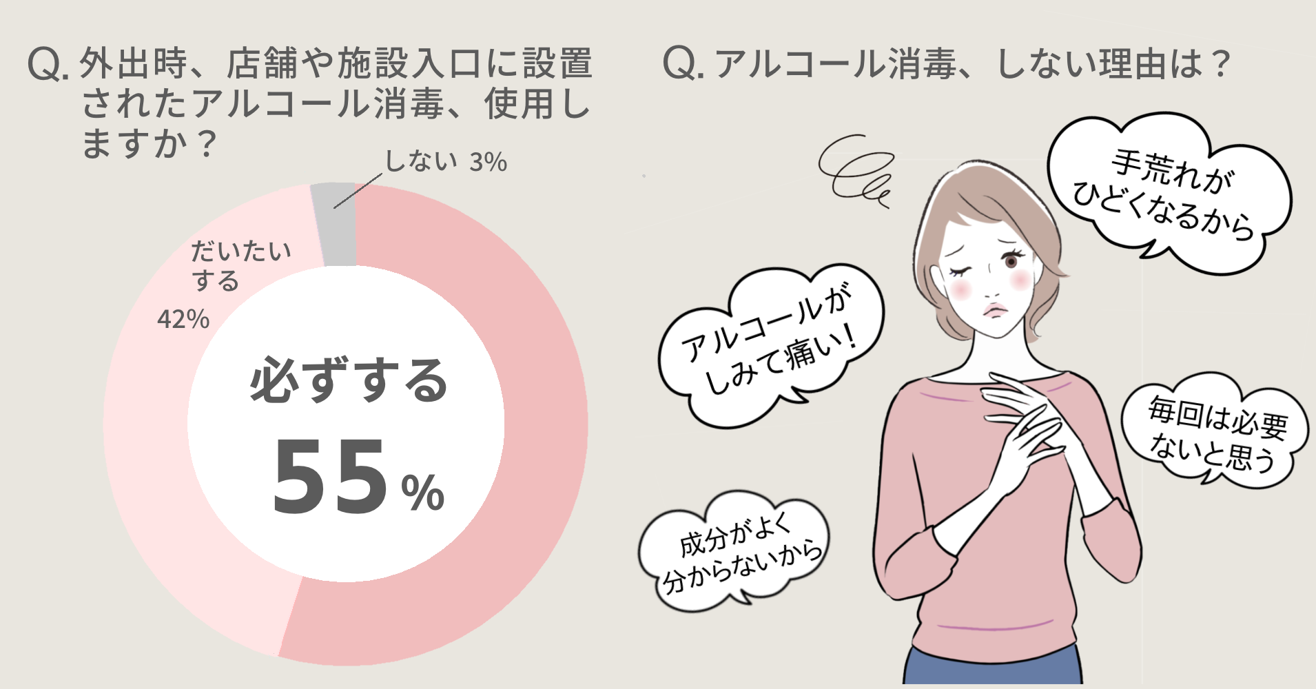 荒れた手にアルコール消毒は多かれ少なかれそれなりの苦痛を伴うため「手荒れの状態がひどく、アルコールが傷口に染みるので(30代女性)」と、アルコール消毒を避けたり躊躇する方も少なくないようです。