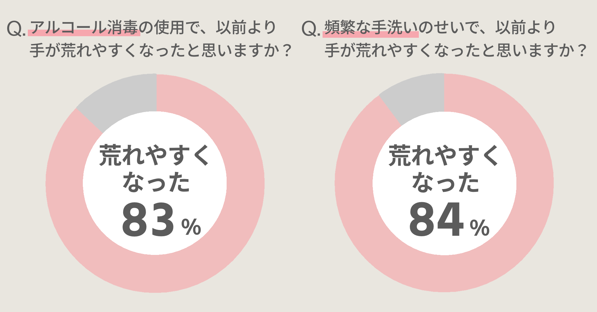 実際にアンケートでお尋ねしたところ、「アルコール消毒の使用で、以前より手が荒れやすくなった」と思う女性は全体の83%。「頻繁な手洗いのせいで、以前より手が荒れやすくなった」と思う女性も、全体の84%にのぼりました。