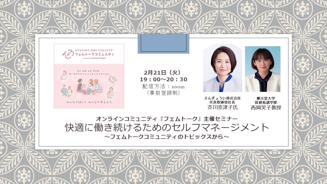 産経新聞社(東京都千代田区、社長・近藤哲司)が発行するフリーマガジン「metropolitana(メトロポリターナ)」が取り組む「Fem Care Project(フェムケアプロジェクト)」は、セミナー「快適に働き続けるためのセルフマネージメント ~フェムトークコミュニティのトピックスから~」を、2月21日(火)19時からオンラインで開催します。
