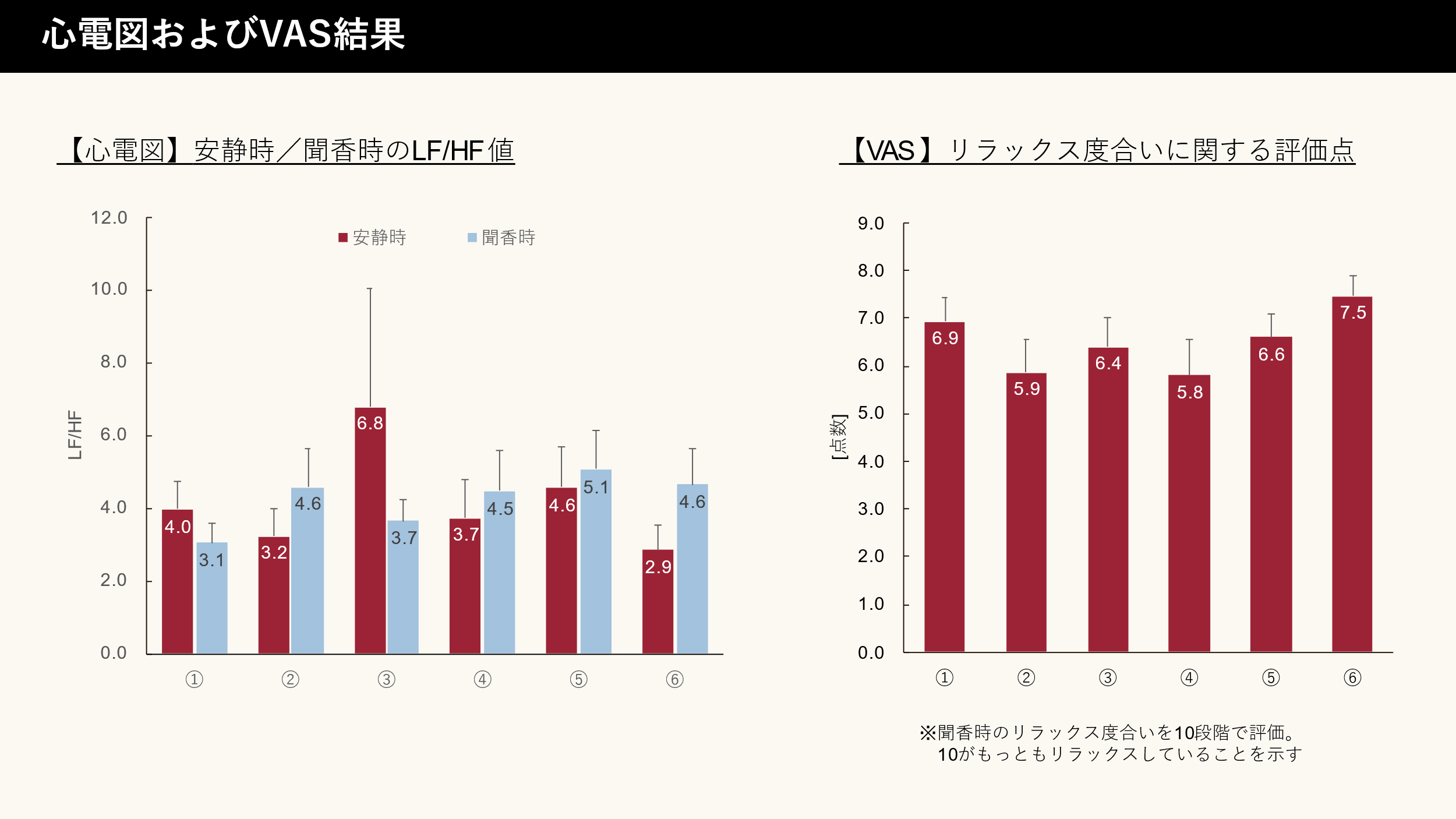 心電図測定の結果、(1)FGおよび(3)HGの2つの香料を嗅ぐとLF/HF値*6が減少する傾向が確認されました。また、主観評価であるVAS法を用いたアンケート評価では、(6)HWがリラックス度合いに関する設問において高い点数を得る結果となりました。