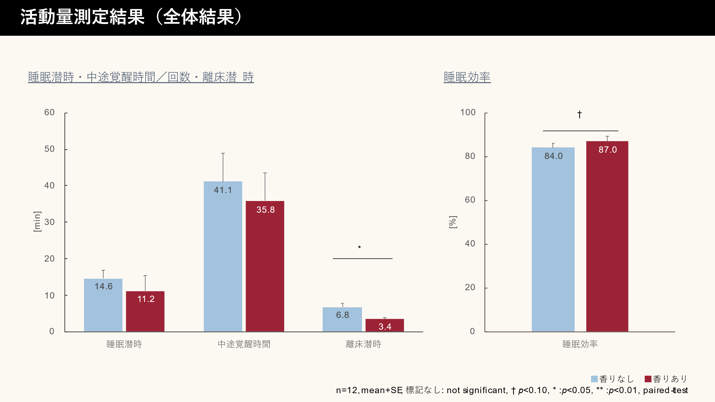 被験者12名の全体解析の結果、3種類の香料のうち好みの香りを就寝中に嗅ぐことにより、目覚めの良さを示す指標である離床潜時は*1、香りなしの場合の6.8±1.1分に比べて、香りありの場合では3.4±0.4分と有意に減少しました。また、睡眠効率*2についても向上する傾向が確認されました。