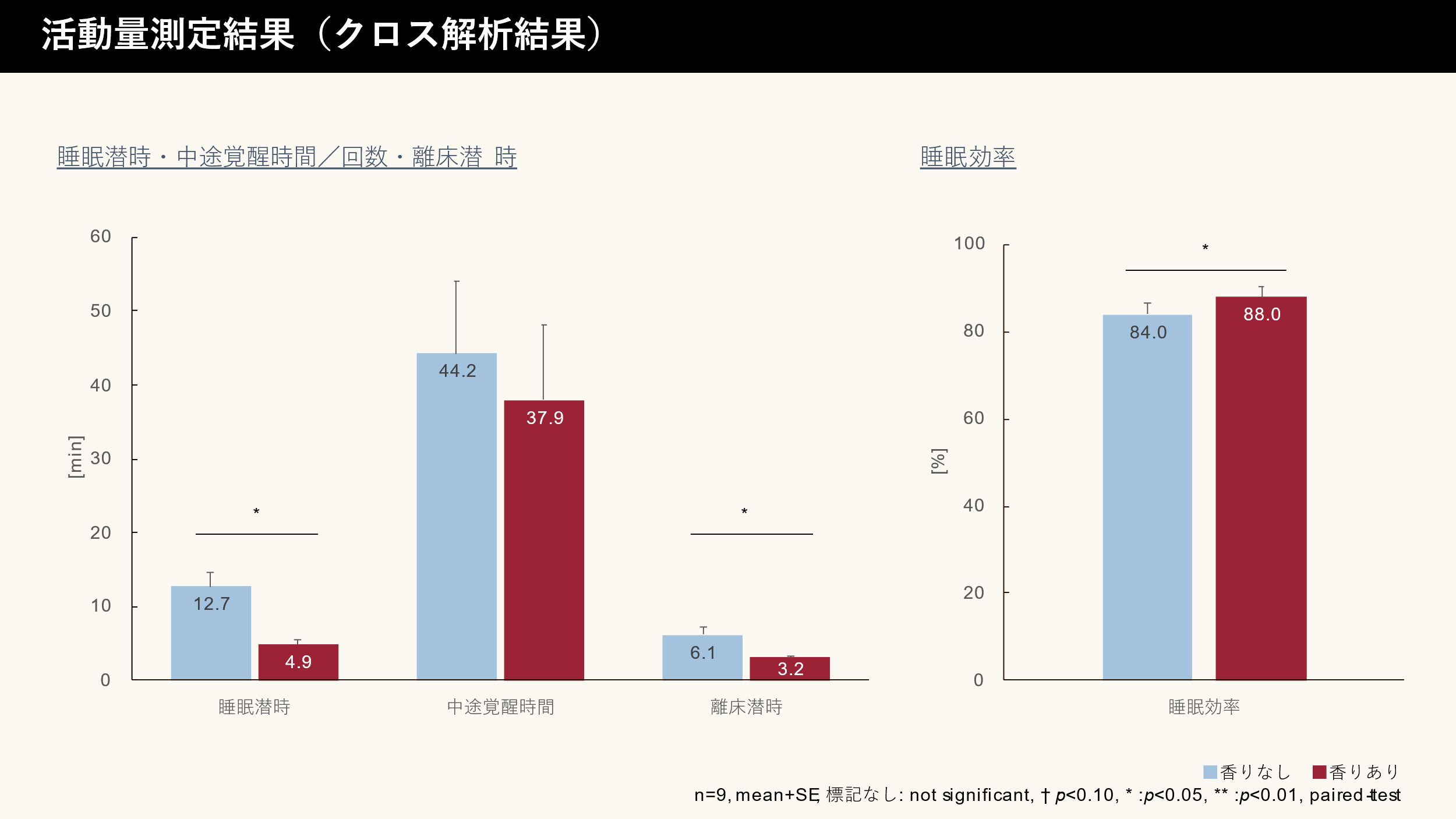 全体結果では、活動量測定から好みの香りを嗅ぐことは目覚めの良さを改善する効果がある可能性が示唆されました。また、睡眠効率の改善傾向も確認されたことから、睡眠の質向上に寄与する可能性も示唆されたといえます。