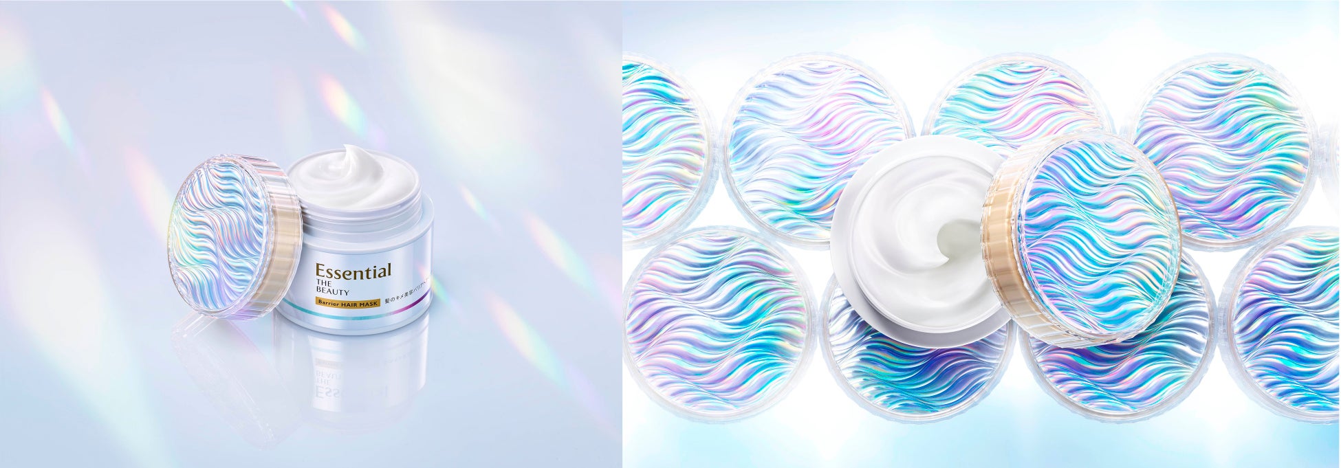『エッセンシャル ザビューティ バリアヘアマスク』は、Essential THE BEAUTY内最高濃度の美髪成分(天然由来の美髪オイル 18-MEA OIL*1(毛髪保護)・セラミドES*2(補修))を配合したスペシャルケアアイテムです。傷んだ髪を集中補修&コートすることで、髪本来のバリア機能*3の働きを補い、湿度変化・摩擦等から髪を守ります。特にカラーを繰り返すなどのヘアアレンジで傷んで、湿度・摩擦等の外部刺激の影響を受けやすい髪に悩む人に向けたスペシャルケアトリートメントです。バスタイムでの気分を高めるような輝くパッケージデザインは、宝石箱をイメージしました。