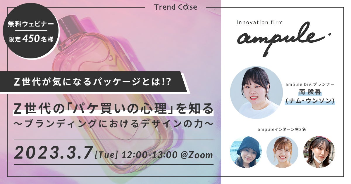 トレンダーズ株式会社(所在地:東京都渋谷区、代表取締役社長:黒川涼子、東証グロース上場:証券コード 6069)が運営する美容特化型イノベーションファーム「ampule(アンプル)」は、無料ウェビナー<Z世代の「パケ買いの心理」を知る~ブランディングにおけるデザインの力~>を、2023年3月7日(火)に開催いたします。