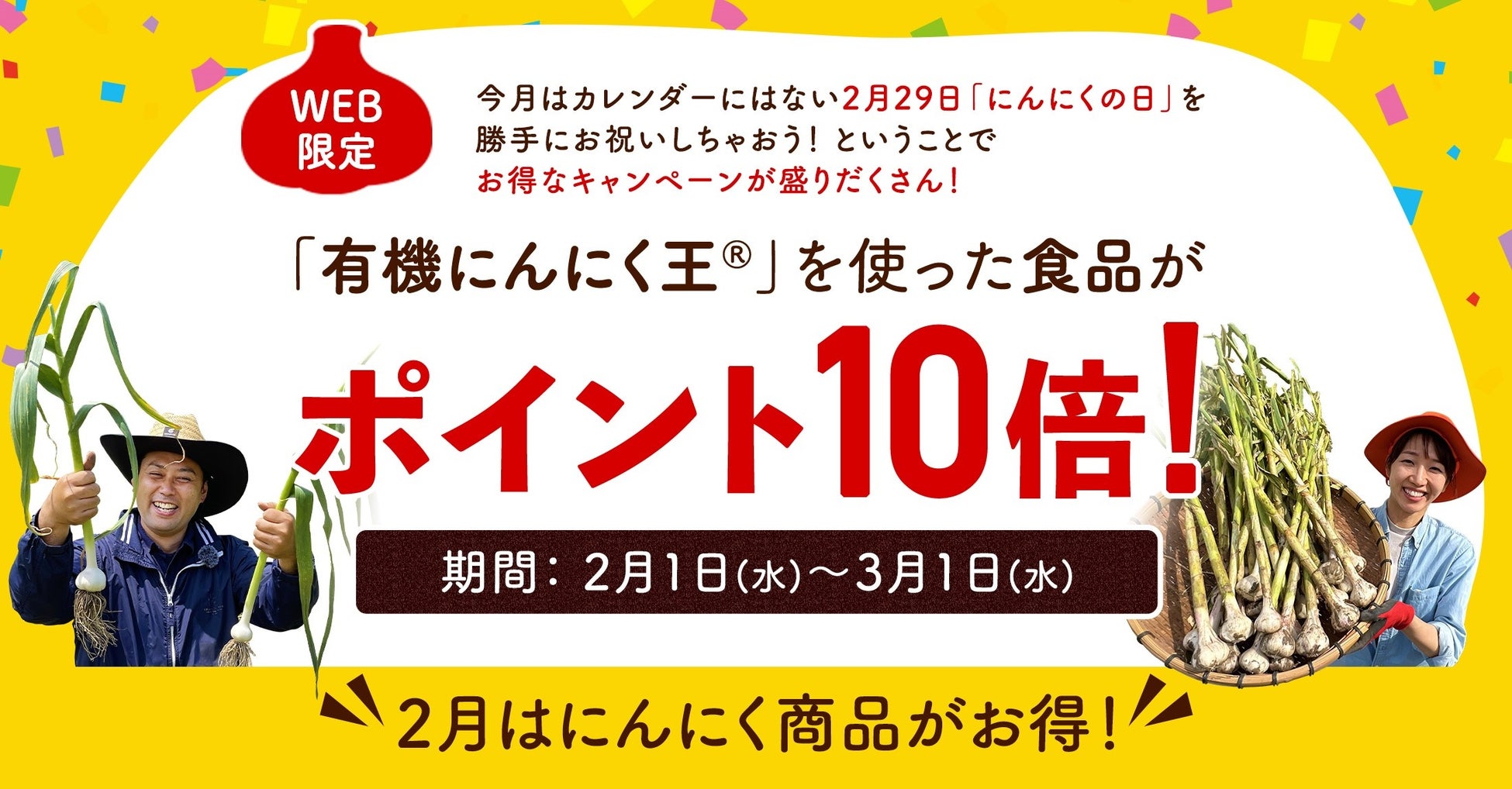 自社農場で有機にんにくを栽培し、それを原料にした商品を販売している株式会社健康家族(本社:鹿児島県鹿児島市平之町、代表取締役:藤 朋子)。「国産&有機」のオリジナルブランド「にんにく王」を使ったこだわりのにんにく食品を、ポイント10倍でお得に買える「にんにく月間キャンペーン」を2023年3月1日(水)まで実施している。