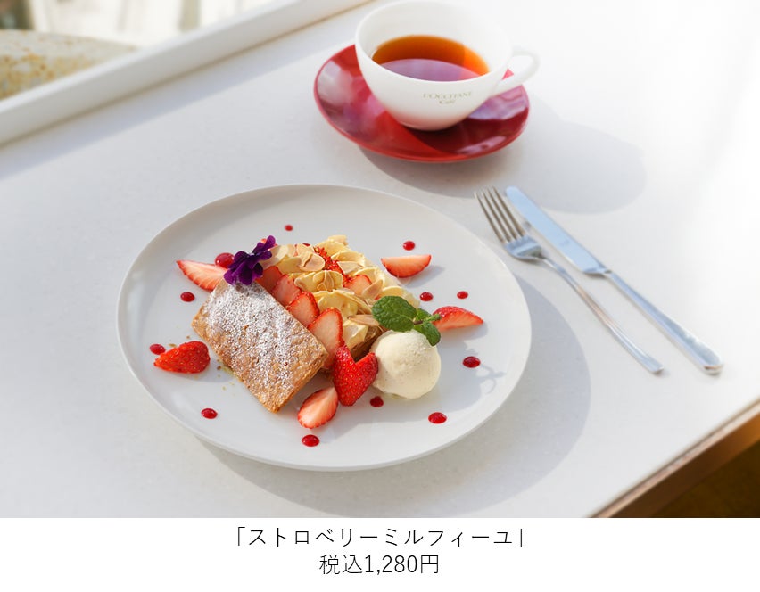 旬の苺とカスタードホイップをサクサクのパイでサンドした「ストロベリーミルフィーユ」は、見た目にも華やかな1品。甘酸っぱい苺と濃厚なカスタードホイップ、さらに横に添えてあるバニラアイスのマリアージュをお楽しみいただけます。