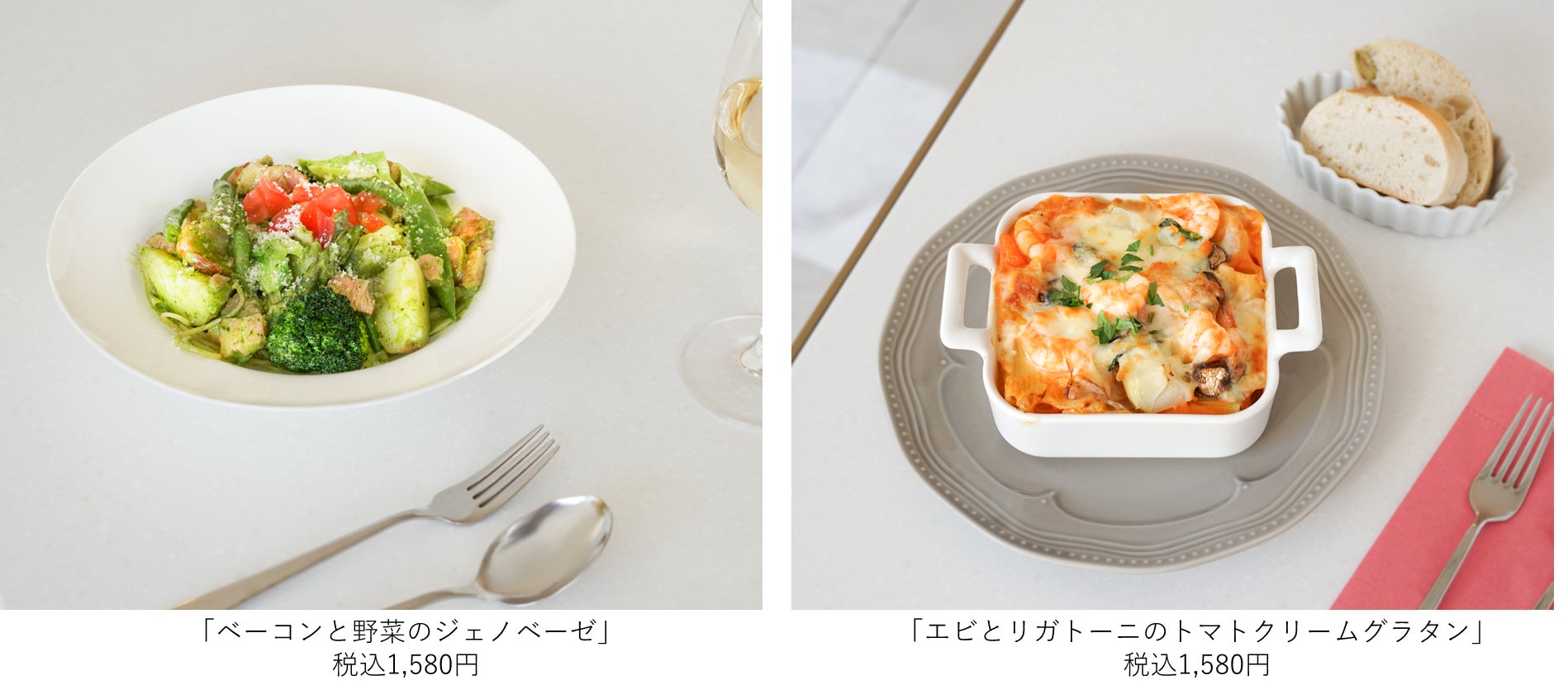 春の喜びを感じられる春野菜を使ったお食事メニューも2品登場。ベーコンと旬の野菜がゴロっと入ったパスタ「ベーコンと野菜のジェノベーゼ」は、アスパラ・キャベツ・ジャガイモなど春の野菜とパスタを、自家製ジェノベーゼソースと生クリームで仕上げました。クリーミーなジェノベーゼソースと、旬の野菜のハーモニーが口の中で広がります。ぷりっぷりのエビが入った、「エビとリガトーニのトマトクリームグラタン」は、リガトーニとエビ、野菜、マッシュルームをトマトクリームであえて、チーズで熱々に焼き上げたパスタグラタン。ランチやディナーにぜひお楽しみください。
