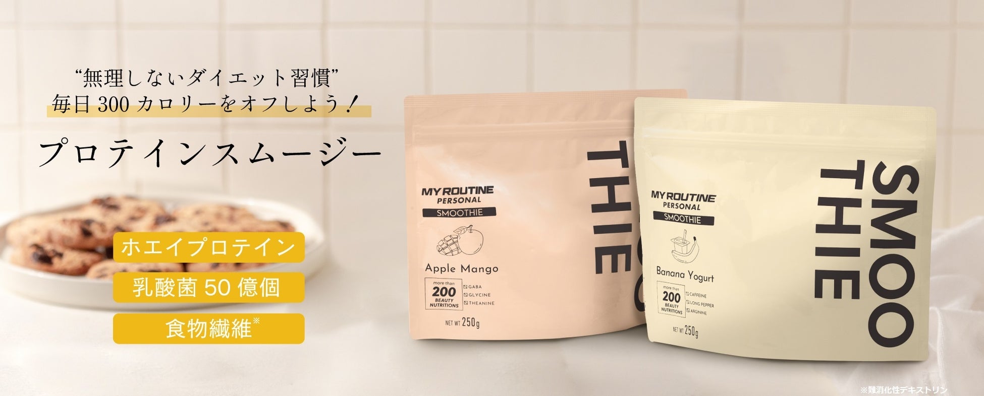 「マイルーティーン パーソナル スムージー」は、無理をしないダイエット習慣を提案する、プロテインスムージーです。健康には欠かせないタンパク質と多くの栄養成分をぎゅっと凝縮し、おいしく続けやすいスムージーに仕上げました。腹持ちも良く、置換えダイエットにぴったりです。