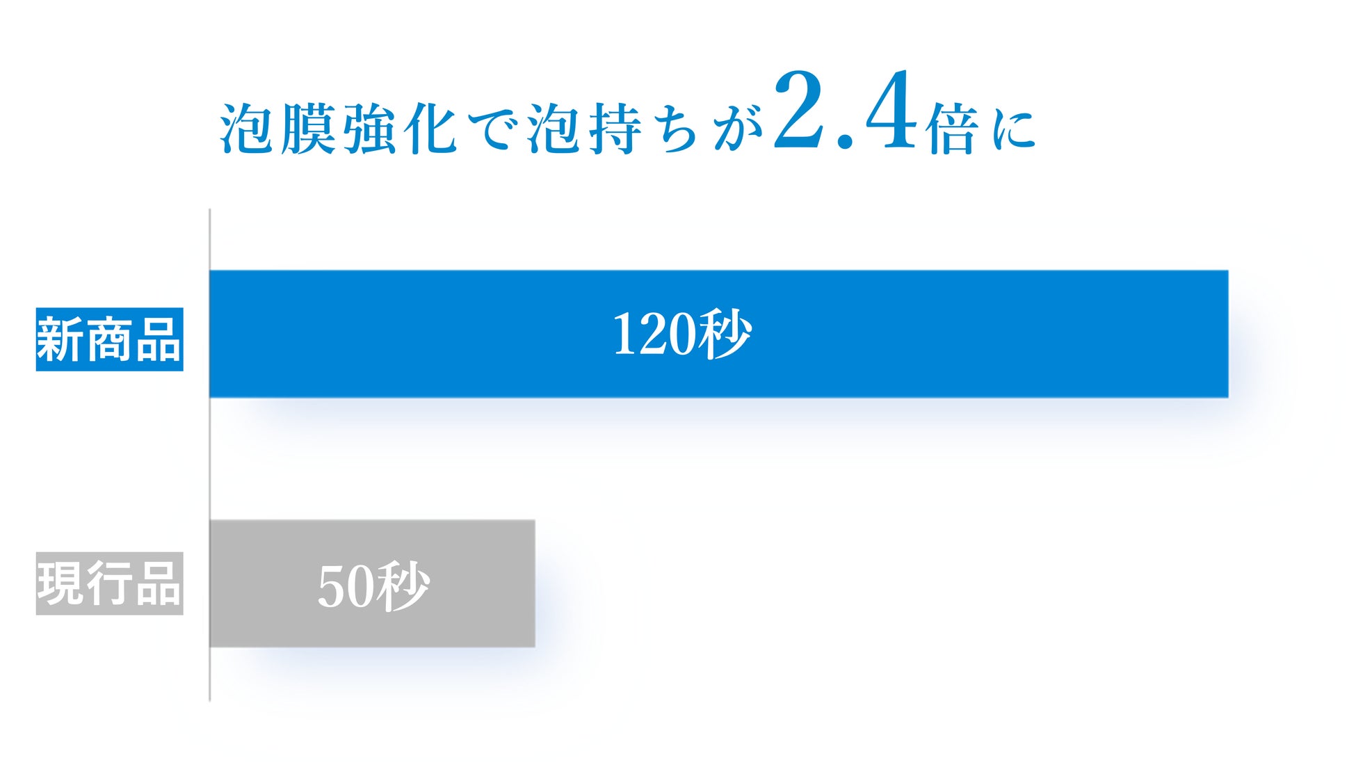 泡のサイズと共に重要な役割を果たすのが「泡の強さ」、気泡を包む「泡膜」です。この泡膜が弱いと破れ、隣り合う泡と結合を繰り返すため、最小の粒度を保つためにも重要な役割を果たします。1,000回以上に及ぶ試作の中で、ベストな活性剤の相性をとらえ、「泡持ち」が2.4倍に。洗顔中も密度の高い泡をキープできることで、クッション泡で摩擦ダメージまでも軽減します。