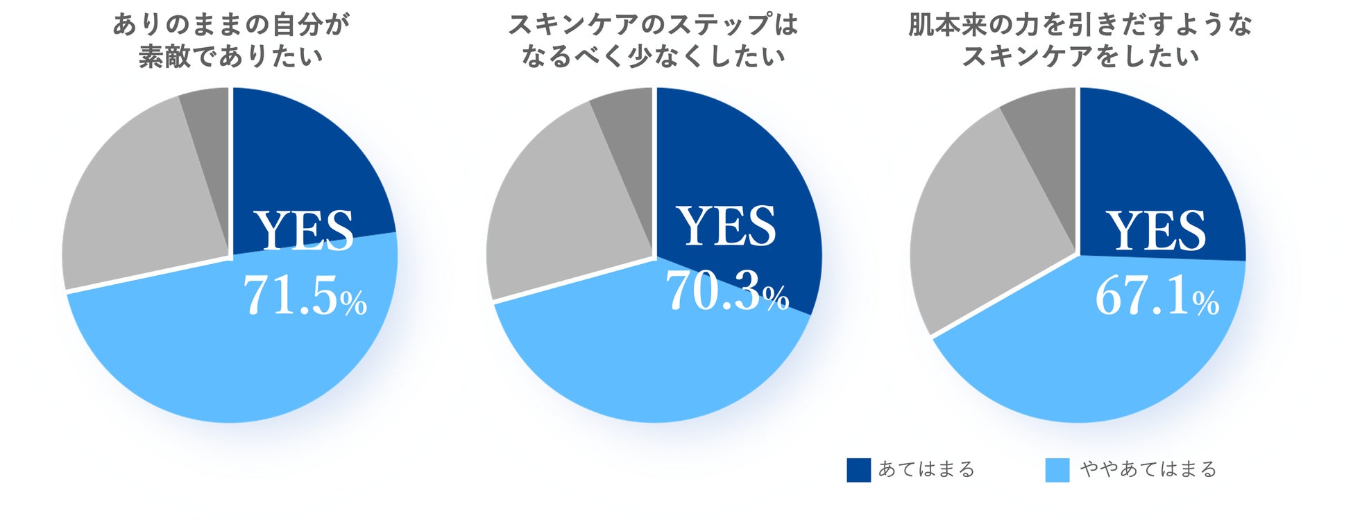 /選択肢:ありのままの自分が素敵でありたいと思うようになった・またはそう思う気持ちが強くなった ありのままの自分を素敵に表現するおしゃれをしたいと思うようになった・またはそう思う気持ちが強くなった、メイクやファッションよりもボディメイクやスキンケアなど自分自身の本来の力や能力を高めるようなことに関心が高まった、メイクの際は隠すのではなく自分の素肌を生かすメイクを意識するようになった、美肌に対する意識が高くなった、肌本来の力を引きだすようなスキンケアをしたいと思う気持ちが高まったスキンケアのステップはなるべく少なくしたいと思うようになった/選択肢:あてはまる、ややあてはまる、あまりあてはまらない、あてはまらない (SA、※3調査による)