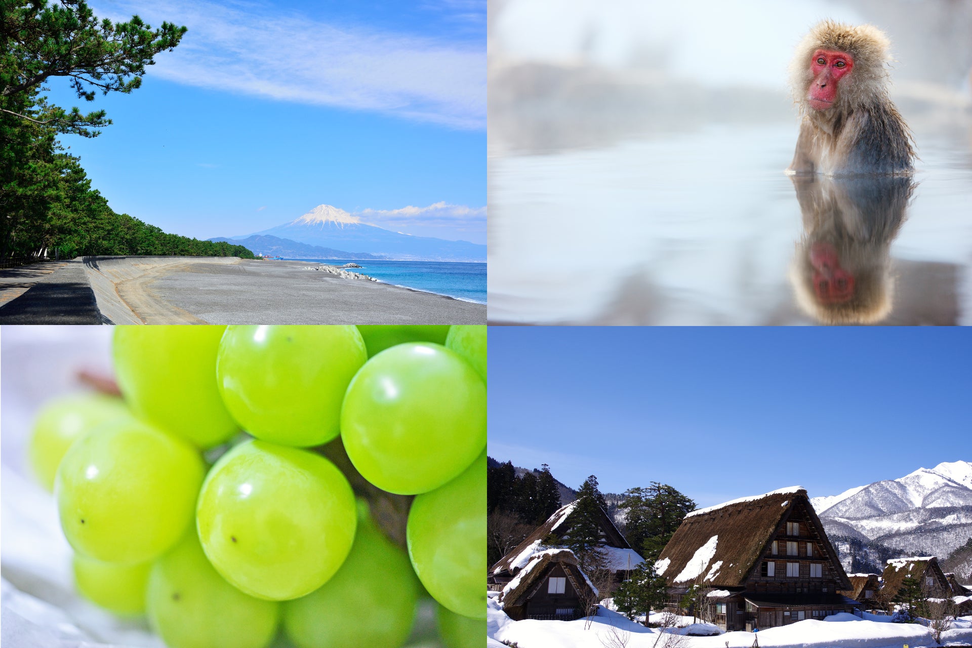 中部では、山梨で真珠のように美しいぶどうに舌鼓。長野では温泉の湯気とともに美しい景色に癒され、岐阜では雪が残り日差しに輝く白川郷を散策。三保の松原からは、白波と富士山の壮大な風景に感動。
