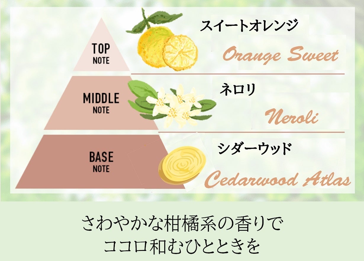 柑橘系のココロ和む『香り』は紫外線で乾燥した肌にうるおいを与える精油を配合。