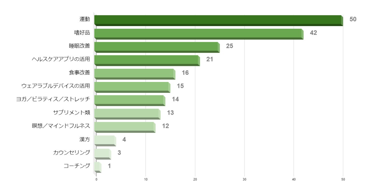 QOLの改善について行っている活動をみると、「運動」(67.6%の人が回答)を筆頭に、「嗜好品」や「睡眠改善」、「ヘルスケアアプリの活用」など多様な選択がみられ、日常生活を豊かにするための方法の多様な分布が分かります。