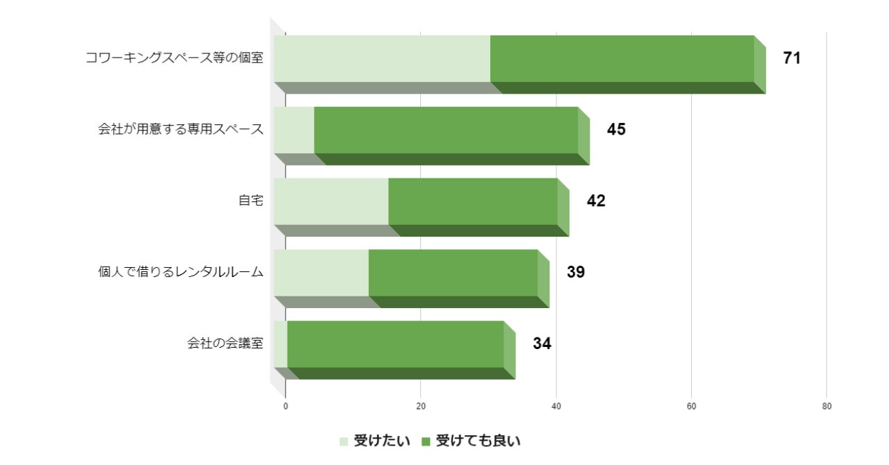 また、カウンセリング・コーチングを受ける場合に、会社の会議室で「受けたい」という人は2.4%、「受けても良い」という人は39%の合計4割程度でした。一方で、コワーキングスペースなどの個室で「受けたい」という人は39%、「受けても良い」という人は47.6%で、8割以上の人がコワーキングスペースなどの個室でカウンセリングやコーチングを受けたいことが分かりました。