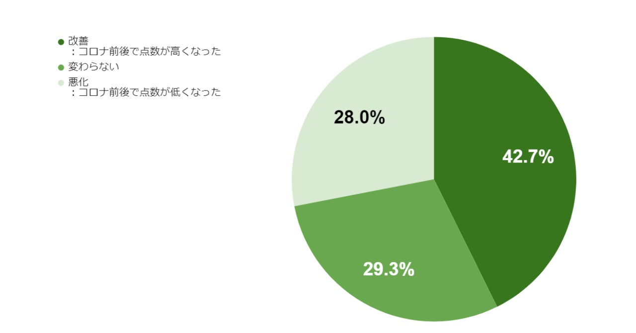 コロナウイルスの流行前と比べて流行後に、心身の健康度が改善したと答えた人は42.7%、変わらないという人は29.3%、悪化したと答えた人は28%でした。改善したと答えた人が比較的多かった一方で、悪化した・変わらないという人も多く、コロナウイルス流行前後でのメンタルヘルスの変化に大きなグラデーションがあることが分かります。