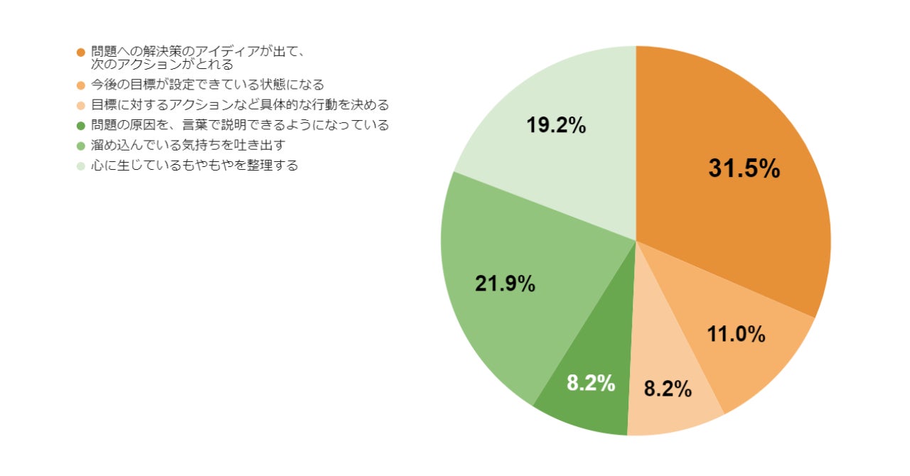 また、悩みの解決に「問題への解決策のアイディアが出て、次のアクションがとれる」「今後の目標が設定できている状態になる」「目標に対するアクションなど具体的な行動を決める」というようなコーチング的な関わりが必要だと答えた人が50.7%いることが分かりました。