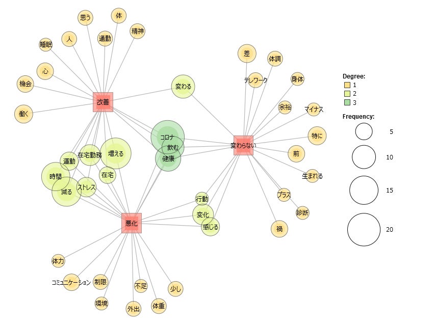 また、回答者個々人をコロナ前後で健康度が改善した人と悪化した人、変わらない人のそれぞれに分類し「(健康度に)差が生まれた理由について教えてください」と質問したところ、改善・悪化にかかわらず「在宅勤務」「時間」などの回答が共通して多く見られました。ただし、改善した人はこれを睡眠などと結びつけて良い方向に捉える一方で、悪化した人はコミュニケーション不足などのネガティブな方向に捉えるなど、同じ事象に対しての受け止めに幅広いグラデーションがあることが分かりました。