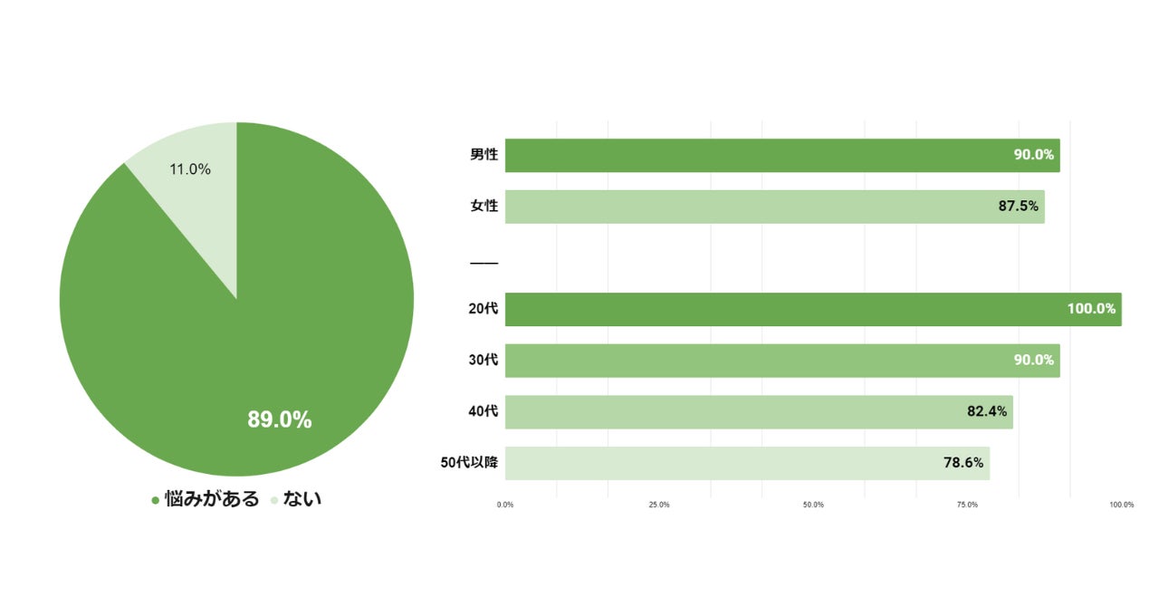 アンケート回答者全体の89%が仕事や家族、自身の悩みありと回答