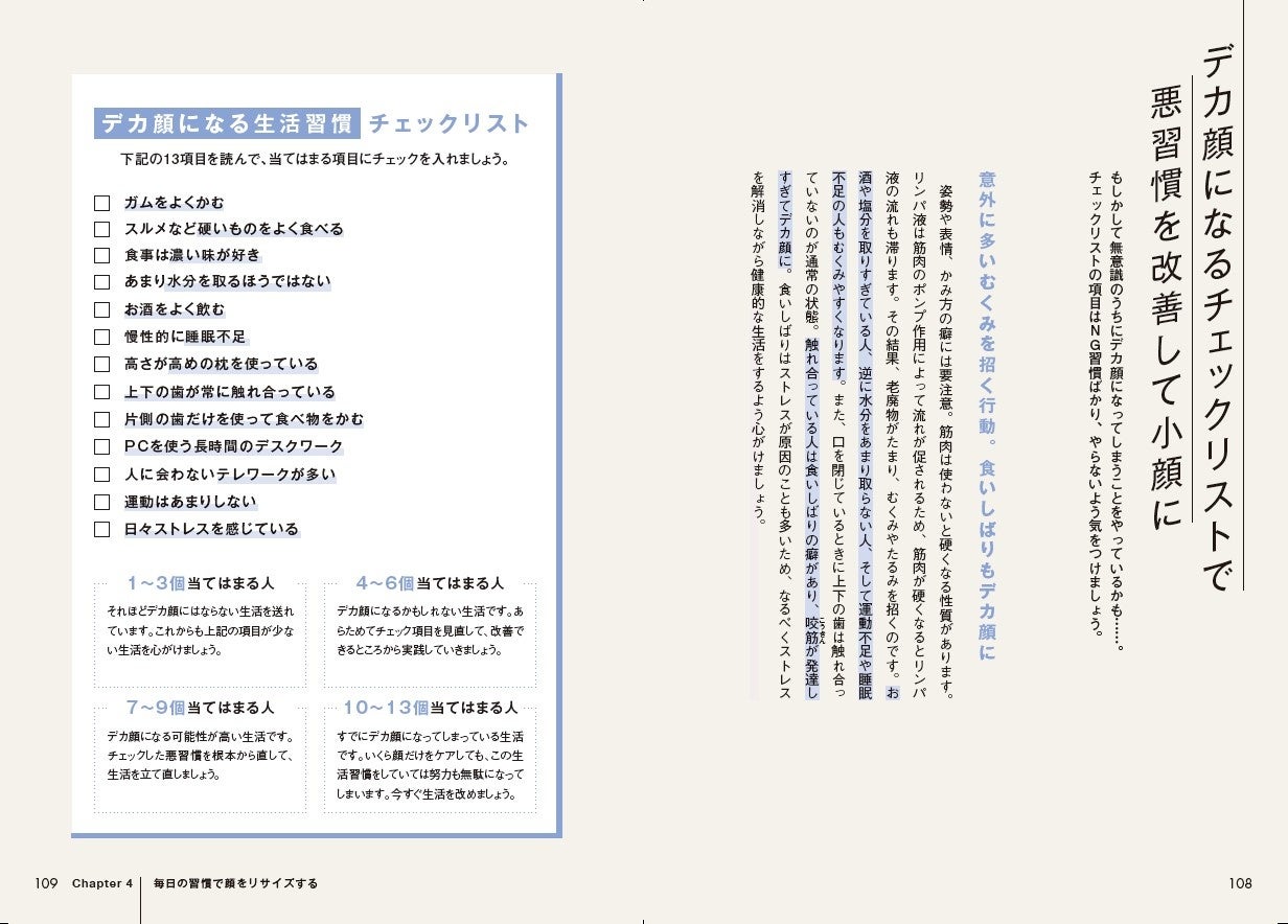 デカ顔になる悪習慣を正すため、セルフチェックを掲載。日常生活の中から小顔を叶える習慣についてもご紹介しています。