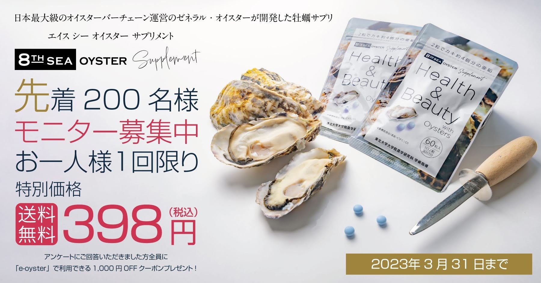 牡蠣の種苗生産・養殖、卸販売、オイスターバーの運営など牡蠣の6次産業化を展開する株式会社ゼネラル・オイスター(本社:東京都中央区、代表取締役社長:吉田秀則)は、東北大学 農学研究科農芸化学専攻の白川仁教授の学術指導により、牡蠣成分由来の栄養機能食品サプリメント『エイス シー オイスター サプリメント』を開発いたしました。4月下旬に公式通販サイト「e-oyster(イーオイスター)」にて販売開始いたします。これに先立ち、2月24日(金)〜3月31日(金)の応募期間で計200名の先行モニターを募集します。https://e-oyster.jp/