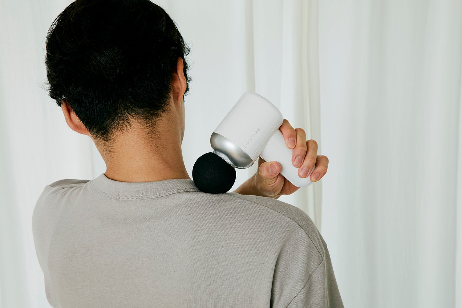 【リカバリーガン】は約2,300回/分~約3,500回/分のパワフルな振動で疲れた身体をケアします。片手で手軽に使用しやすいよう、コンパクトなガンタイプの形状で、ケアをしたい部位へピンポイントに当てることが可能です。ご自宅のリビングや寝室での使用はもちろん、ジムや職場等のお好きな場所に持ち運んでいつでも気軽にご使用いただけます。