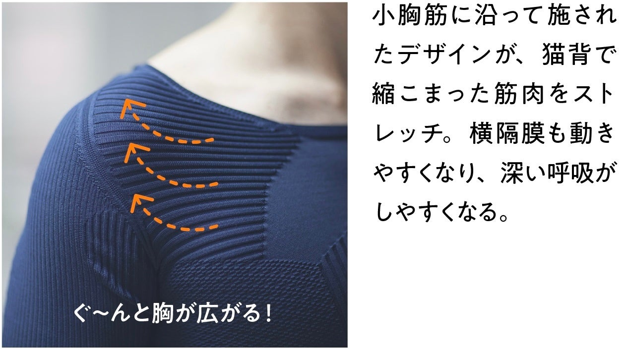 「Kikuchi 鍼灸院」に“なんとなく不調”で駆け込む患者さんの多くに見られるのが、背中が丸まって横隔膜の動きが小さくなり、普段の呼吸が浅くなっていることでした。「SHUttonal(シュットナル。)」を着用すると肩や胸が開き、深い呼吸がしやすくなります。深い呼吸は、心身の健康にもプラスの効果が期待できるでしょう。