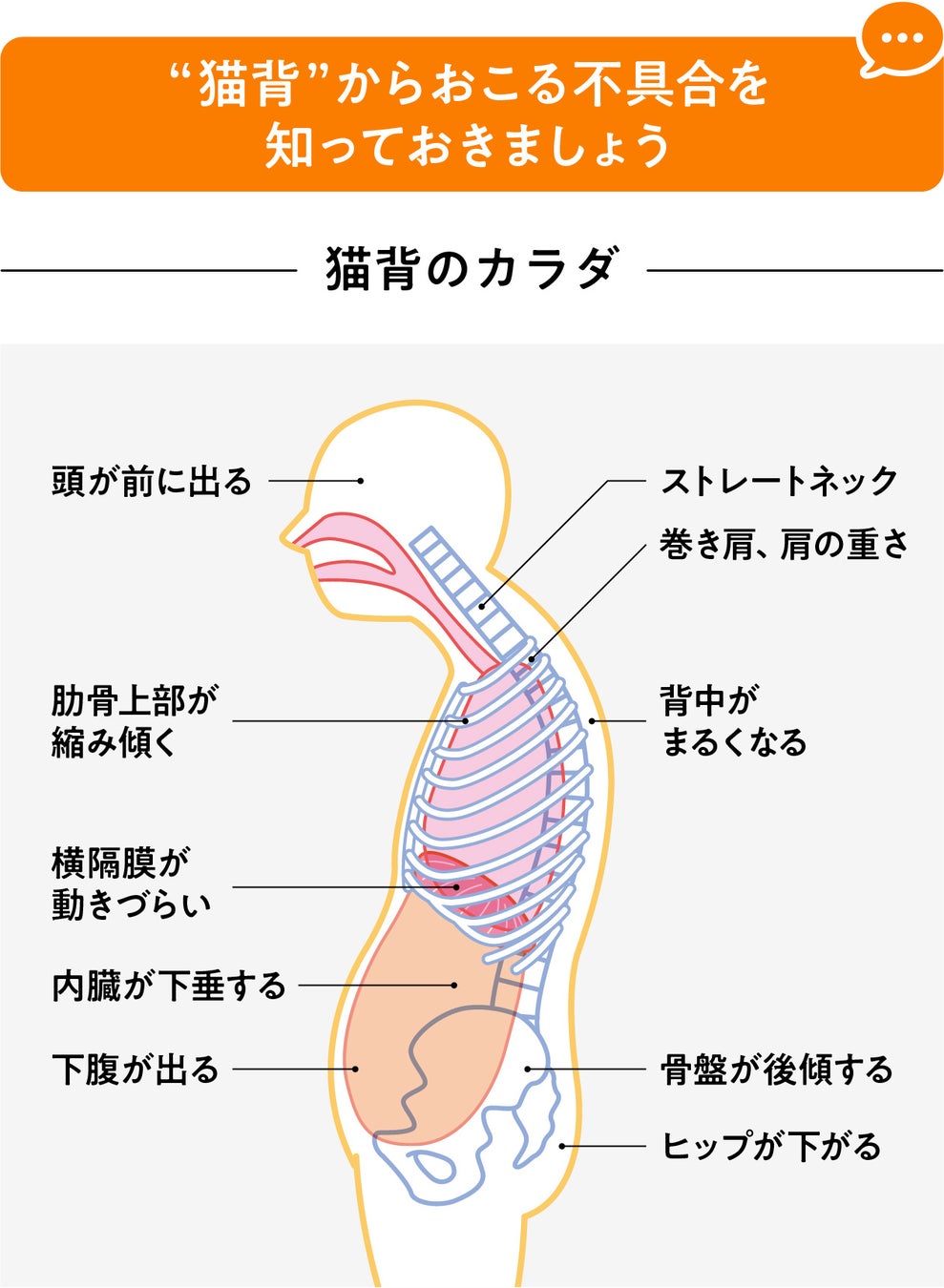❷ “猫背”により、呼吸が浅くなることで引き起こす悪循環にも注目