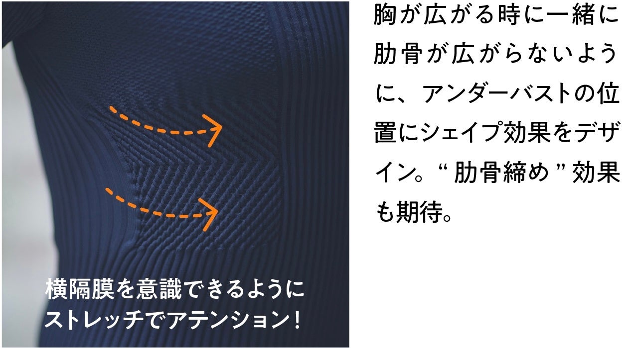 これにより加圧ウエアのような窮屈さはなく、縫い目もなくソフトな着心地が特徴です。編地の特性や技法を使い分け、伸びるところは伸び、伸びない所は伸びないように巧みに設計。男女問わず、いろんな体型の人にもフィットしながら、必要な箇所にストレッ チをかけられることを可能にしました。