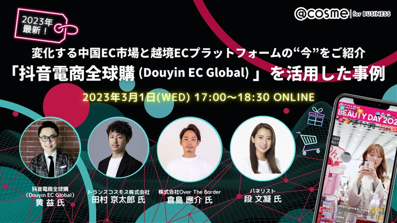 登壇者には、中国の短尺動画プラットフォーム「抖音(Douyin)」の越境ECサービス「抖音電商全球購(Douyin EC Global)」の日本市場の責任者である黄氏、日本最大のBPO企業であり、中華圏でもECのワンストップサービスやデジタルマーケティングサービスを提供するトランスコスモスの田村氏、「抖音電商全球購(Douyin EC Global)」にコスメカテゴリで日本企業初のセレクトショップ型越境EC旗艦店「@cosme海外旗艦店」を出店するOver The Borderの倉島を迎え、それぞれの立場から「今」の中国越境EC市場を解説いただくとともに、その具体的な進出の方法として「抖音電商全球購(Douyin EC Global)」の活用についてもお話いただきます。