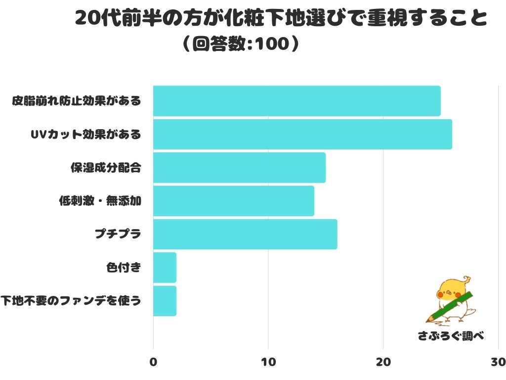 20代前半の方が化粧下地選びで重視することをアンケートにて調査したところ、1位は「UVカット効果がある」でした。