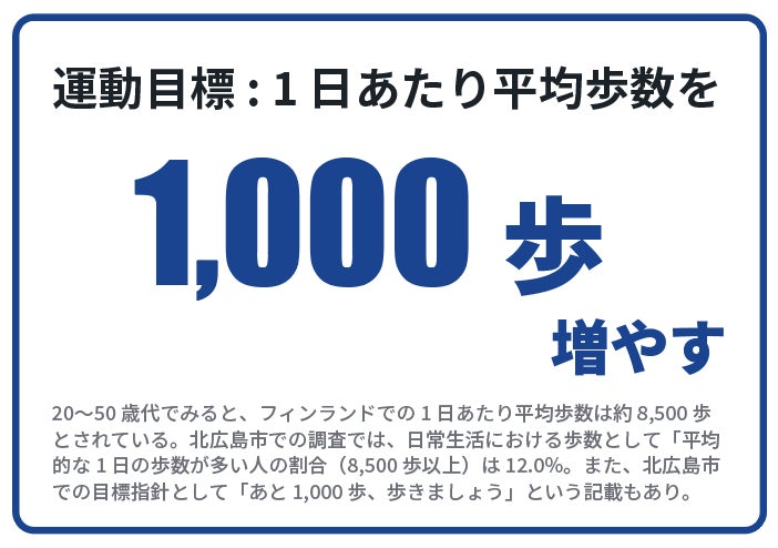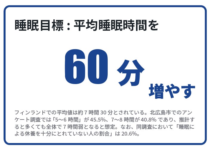 本事業では、世界一健康なまちづくりに向け、事業に参加した北広島市民の睡眠と運動 2 つの活動水準を測定し、2024 年 3 月末までに世界一の幸福度を誇るフィンランドでの統計値を超えることを目標に設定しています。