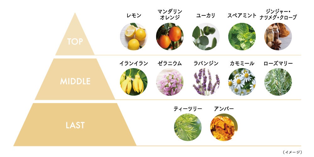レモン、マンダリンオレンジ、ローズマリー、イランイラン他ブレンド。