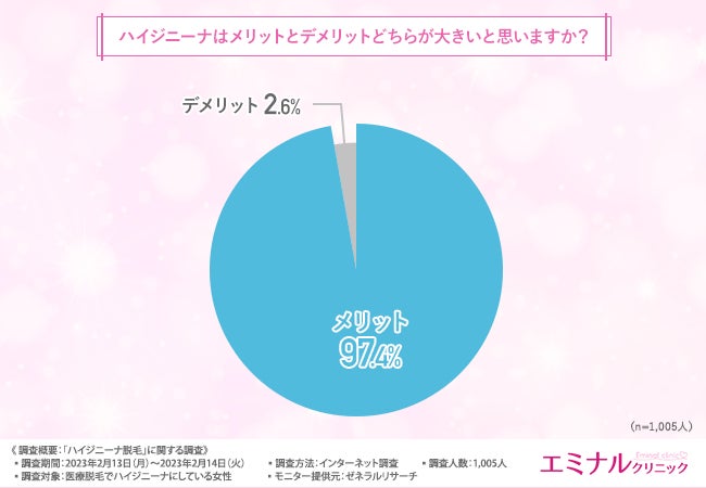 「ハイジニーナはメリットとデメリットどちらが大きいと思いますか?」と質問したところ、ほとんどの方が『メリット(97.4%)』と回答しました。