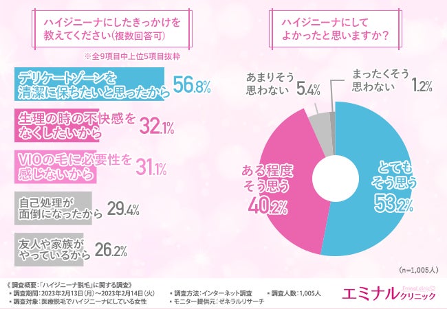 そこで今回、医療脱毛のエミナルクリニック(https://eminal-clinic.jp/lp01/?refmedia=11073)は、医療脱毛でハイジニーナにしている女性を対象に、「ハイジニーナ脱毛」に関する調査を実施しました。