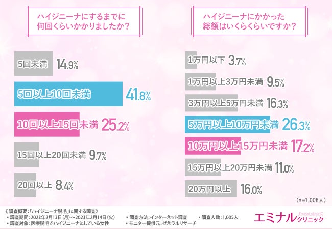「ハイジニーナにするまでに何回くらいかかりましたか?」と質問したところ、『5回以上10回未満(41.8%)』『10回以上15回未満(25.2%)』と回答しました。