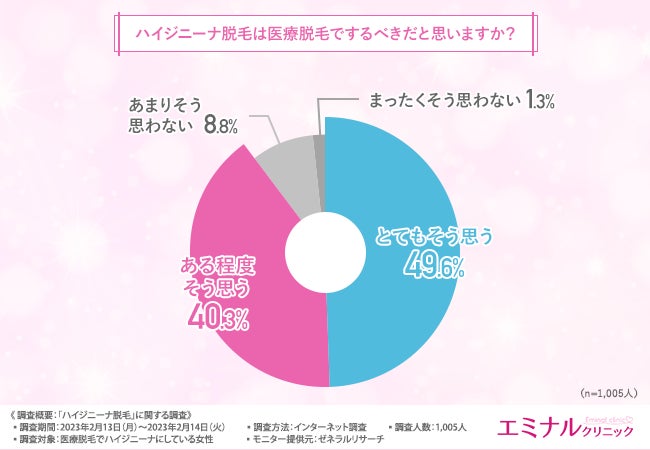 「ハイジニーナ脱毛は医療脱毛でするべきだと思いますか?」と質問したところ、約9割の方が『とてもそう思う(49.6%)』『ある程度そう思う(40.3%)』と回答しました。