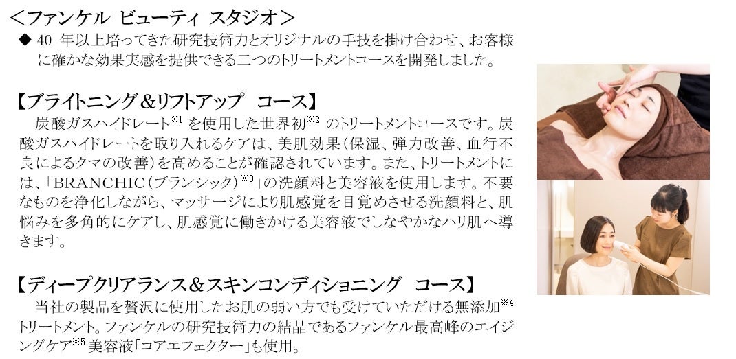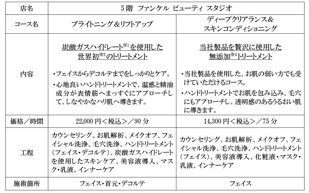 株式会社ファンケルの旗艦店であるファンケル 銀座スクエア(東京都中央区銀座5-8-16、以下 銀座スクエアと表記)は、2003年に、ファンケルブランドの象徴である「美と健康」が体験できる旗艦店としてオープンし、今年の4月で20周年を迎えます。20周年を記念し、4月18日(火)から5階と6階のカウンセリングメニューを刷新します。これに伴い、5階の「ファンケル パーソナルカウンセリング ビューティ」から「ファンケル ビューティ スタジオ」に、6階を「ファンケル パーソナルカウンセリング ヘルス」から「ファンケル ヘルス スタジオ」と店名を変更します。炭酸ガスハイドレート※1を使用した世界初※2のトリートメントコースも用意し、お客様一人ひとりに向き合った美容と健康のサービスを提供してまいります(予約は3月16日(木)から開始します)。